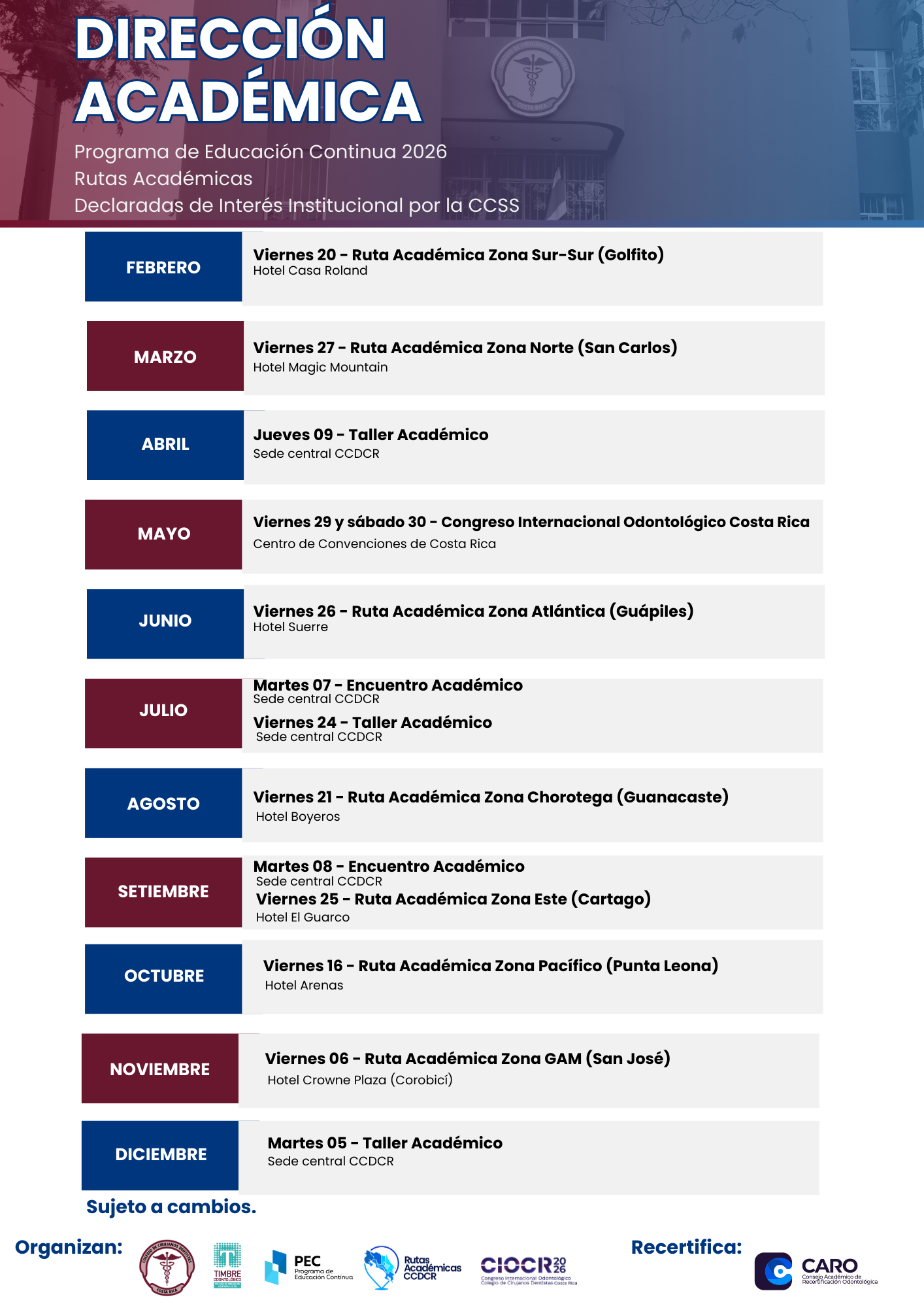La Dirección Académica del Colegio de Cirujanos Dentistas de Costa Rica informa que, como parte de su compromiso con la Educación Continua, cada año se desarrolla el Programa de Rutas Académicas, el cual lleva actualización profesional a distintas zonas del país.