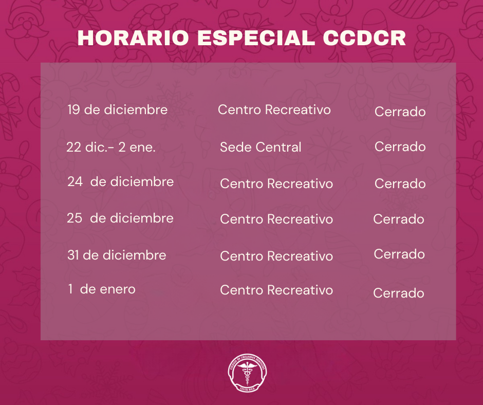 Compartimos el horario especial del Colegio de Cirujanos Dentistas de Costa Rica, tanto de su Sede Central como del Centro Recreativo, en ocasión de las celebraciones de fin de año.